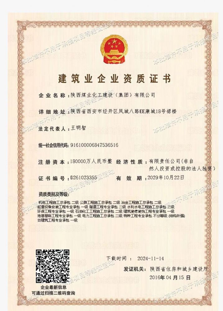 擁有建筑工程施工總承包、礦山工程施工總承包“雙特級”資質和建筑行業甲級、煤炭行業(礦井、選煤廠)專業甲級設計資質;市政公用工程、鋼結構工程、起重設備安裝工程、環保工程、建筑裝修裝飾工程、地基基礎工程、古建筑工程一級承包資質;機電工程、公路工程、冶金工程、鐵路工程、水利水電工程、石油化工工程、電力工程、隧道工程二級承包資質,同時具有特種工程專業承包資質。